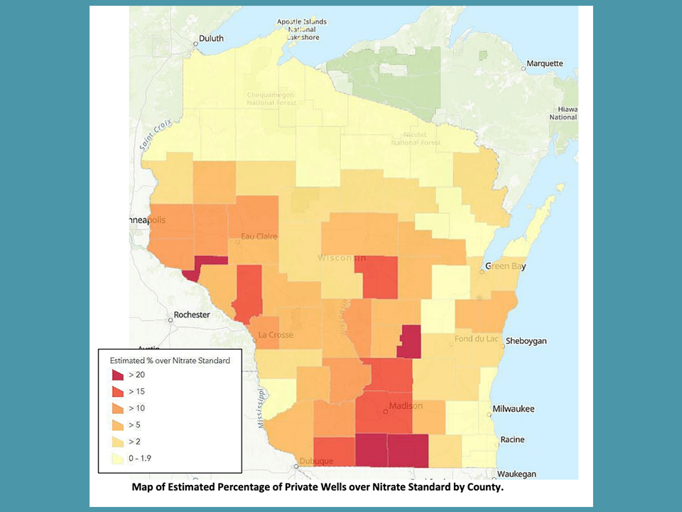 To date, more than 42,000 homes with private wells contain water with nitrate levels exceeding health standards in Wisconsin, according to a 2019 report by a committee of the Wisconsin Department of Natural Resources. Elevated levels of nitrate can be caused by fertilizer from farms and lawns as well as wastewater and animal waste. The department estimates it would cost half a billion dollars to replace those affected wells.