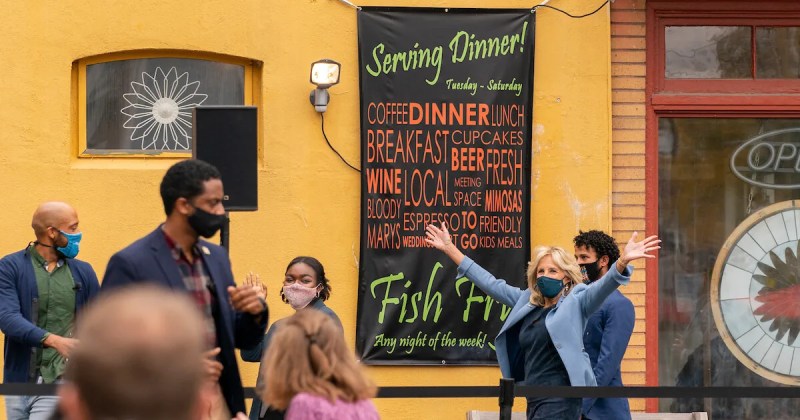 “For the first time in a long time you take a deep breath, and you feel hope,” Biden told a crowd of roughly 100 to 150 people Monday who gathered outside Daisy Cupcake Cafe in Madison to hear her speak. “That’s the Nov. 4 I want. And I know you do, too.”