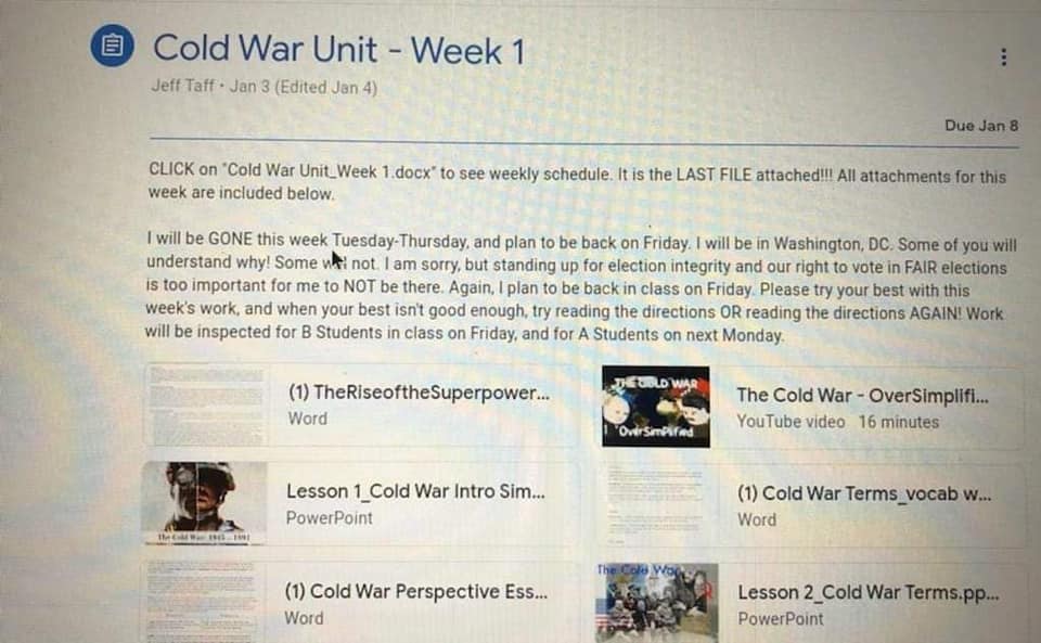 “Some of you will understand why! Some will not,” Taff wrote to his students. “I am sorry, but standing up for election integrity and our right to vote in FAIR elections is too important for me to NOT be there.”