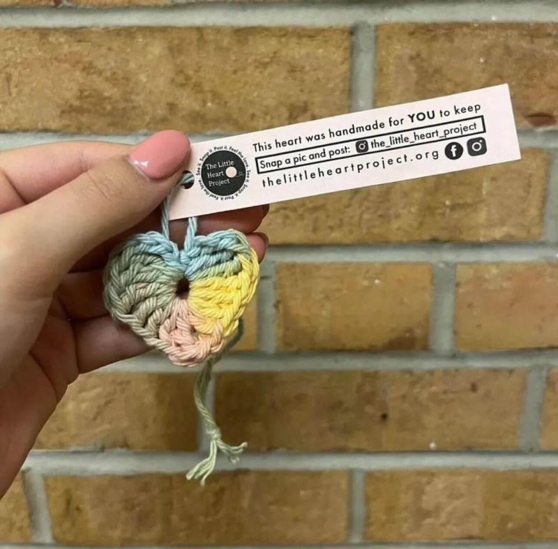 Last April, she decided to make her pastime-turned passion her purpose and created The Little Heart Project, a motivational mental health movement where Kathleen crochets two-inch hearts, attaches encouraging notes, and leaves them around town.