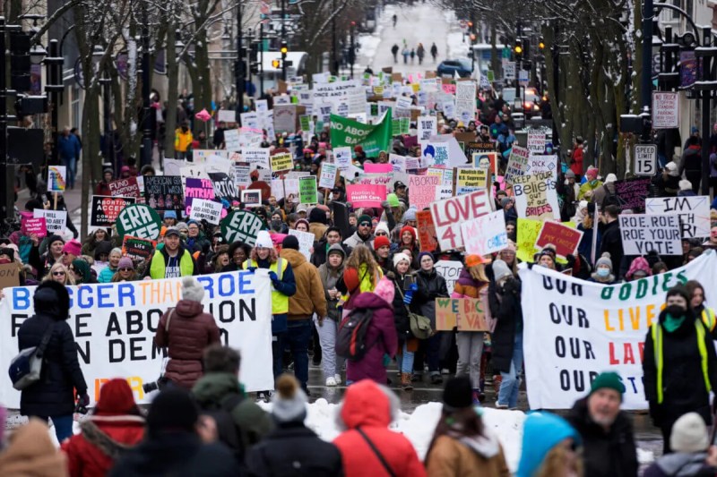 Protesters make their way to the Wisconsin Capitol Rotunda during a march supporting overturning Wisconsin's near total ban on abortion Sunday, Jan. 22, 2023, in Madison, Wis. (AP Photo/Morry Gash)