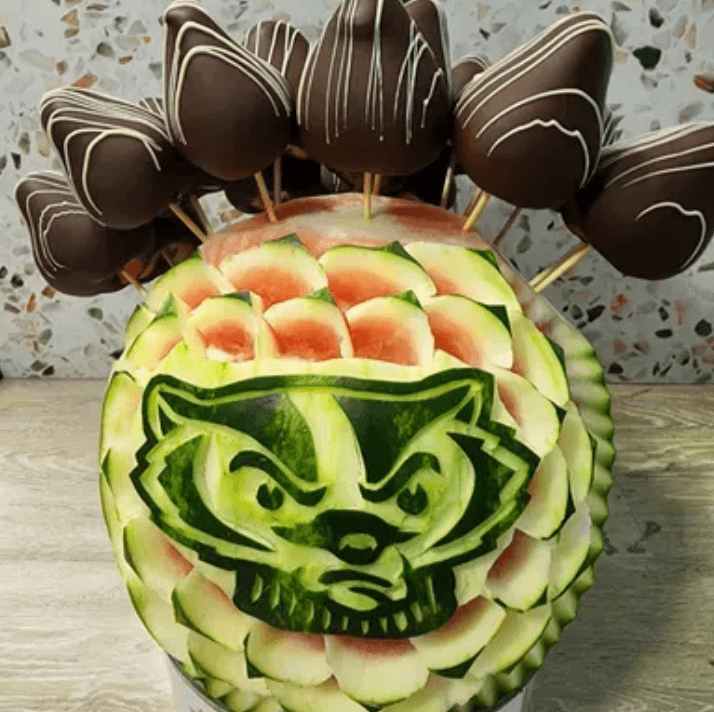 Eder Valle, Owner: We create unique, edible artwork using watermelons and chocolate-covered strawberries in both small and large fruit bouquets. The small comes with 12 strawberries, and the large comes with 18. We can also create faces, custom names, and business logos.