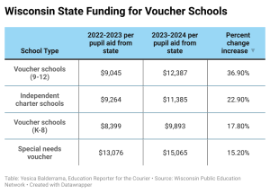 In the school years of 2022-2023 and 2023-2024, voucher schools for grades 9-12 had the greatest budget growth, at $12,387 funding per pupil. During that same time period, 39% of public schools received less state aid according to data by the Wisconsin Public Education Network. The revenue limits for each district can be found here.