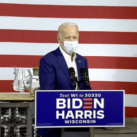 Democratic candidate used Wisconsin visit to say the president “panicked,” leading to 200,000 coronavirus deaths.