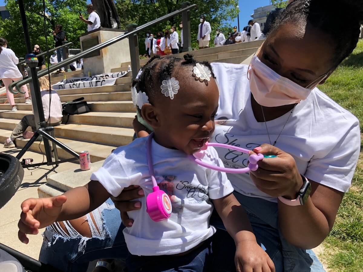 Lexus Carter holds her daughter, Azaria McFadden, as the 1-year-old plays with a toy stethoscope in honor of her aunt, India Carter. Carter was a speaker at the White Coats for Black Lives demonstration and a recent graduate of the UW School of Medicine and Public Health. (Photo by Jessica VanEgeren)