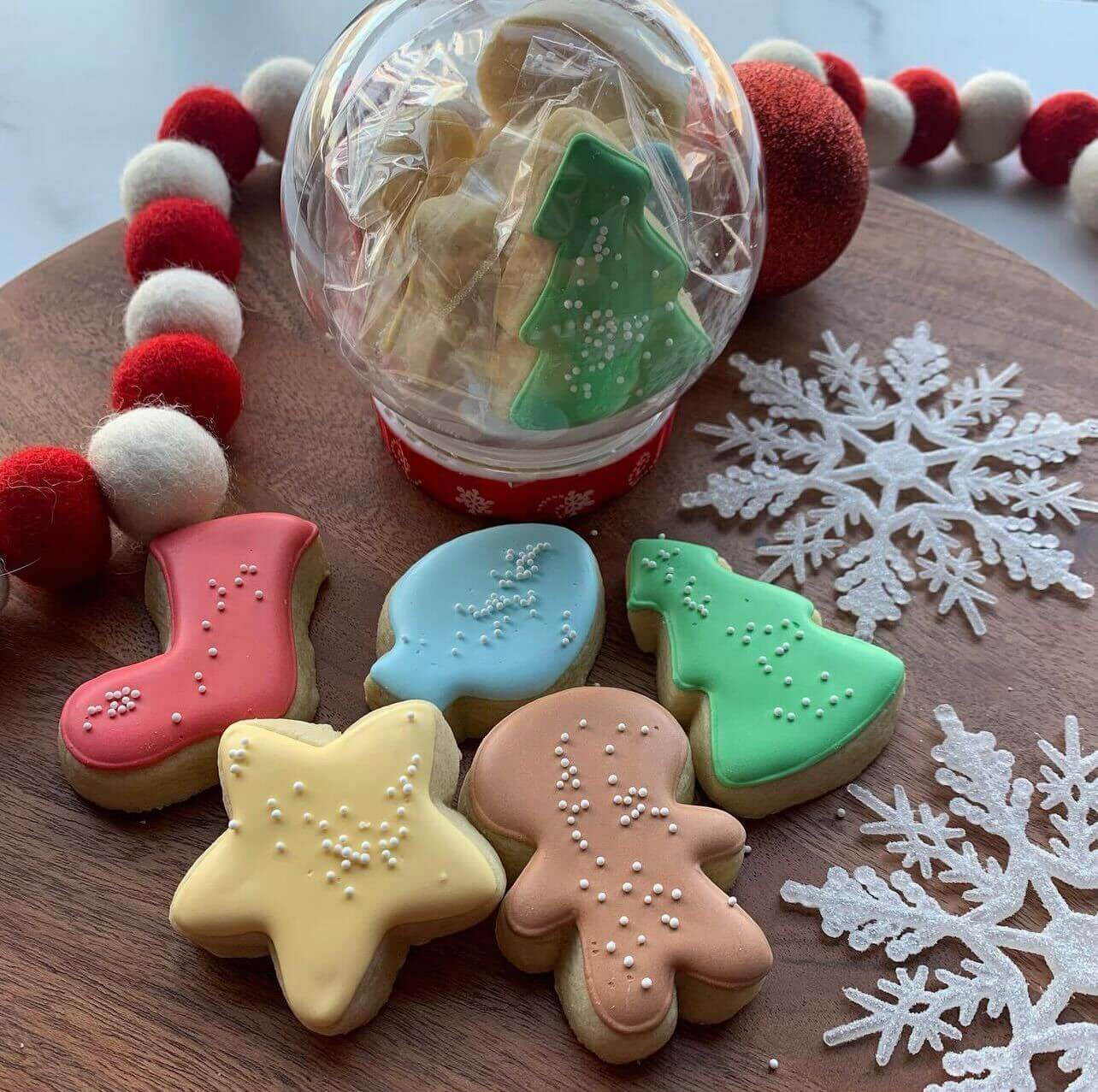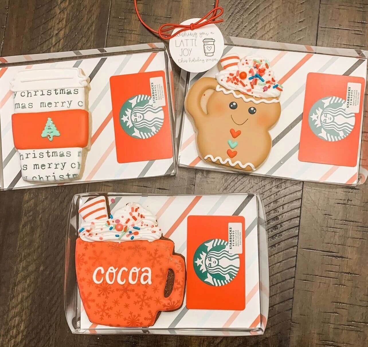 One of my favorite things to do is to combine cookies with gift cards! My best-seller every holiday season is a cookie decorated like a coffee mug, placed inside a gift box with a gift card for a coffee shop. It’s also fun to put mini-sized cookies in printed paper cups or even snow globes from the dollar store! Add snowflake-shaped sprinkles to make it extra fun!