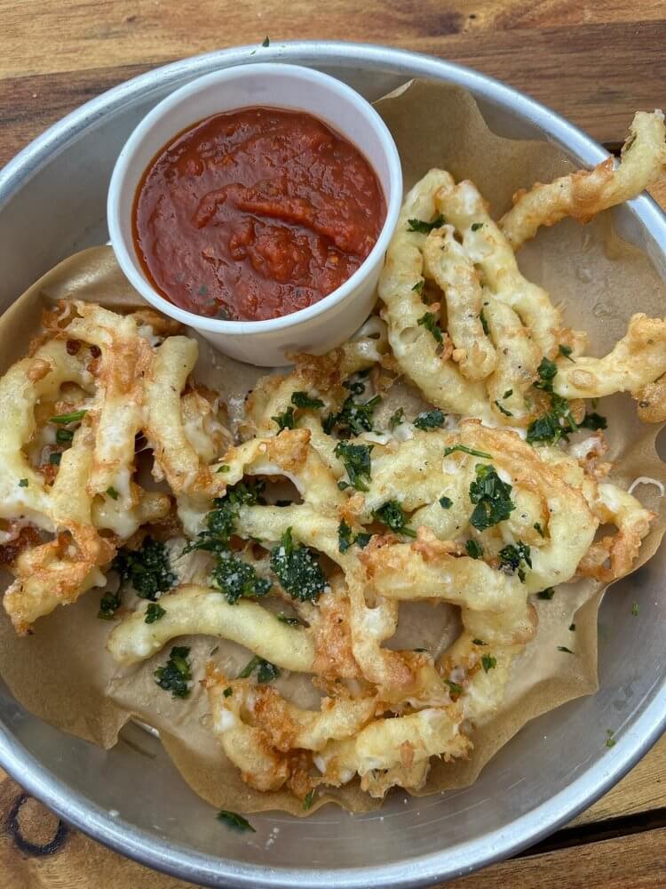 What It Is: This isn’t your average funnel cake—it’s a Wisconsin funnel cake. That means it’s made with tempura-battered mozzarella whips instead of regular dough and served with marinara, not powdered sugar.