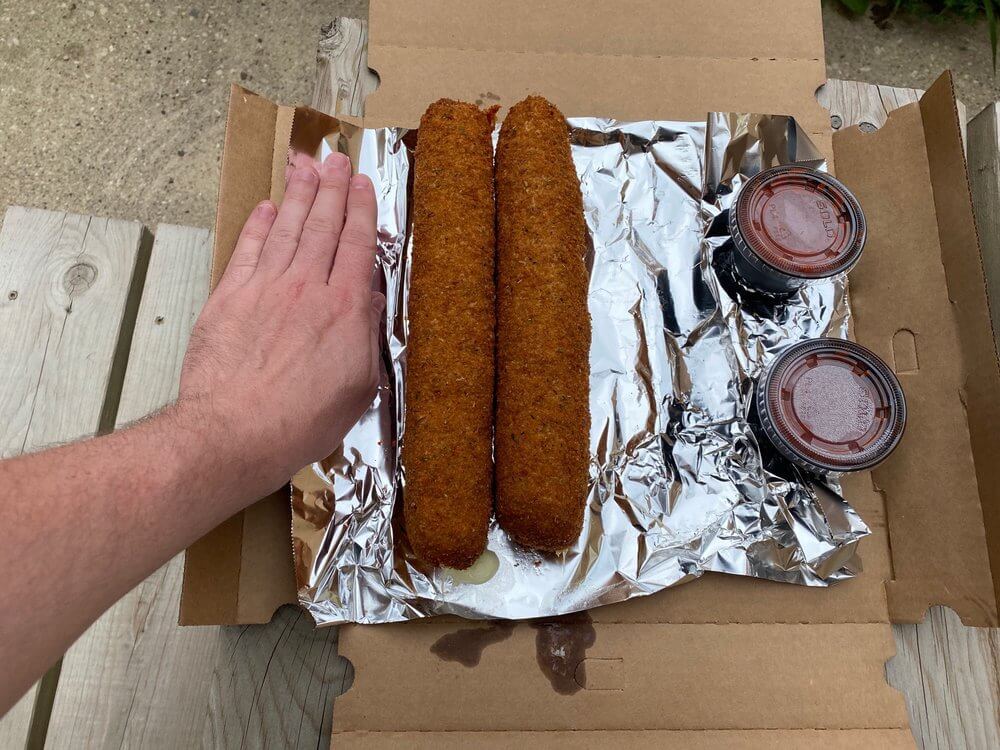 What They Are: Giant breaded batons of deep-fried mozzarella cheese—and we mean giant. Each stick measures about the length of a ruler and the width of six “regular” cheese sticks put together. ( Learn the story behind them here.)