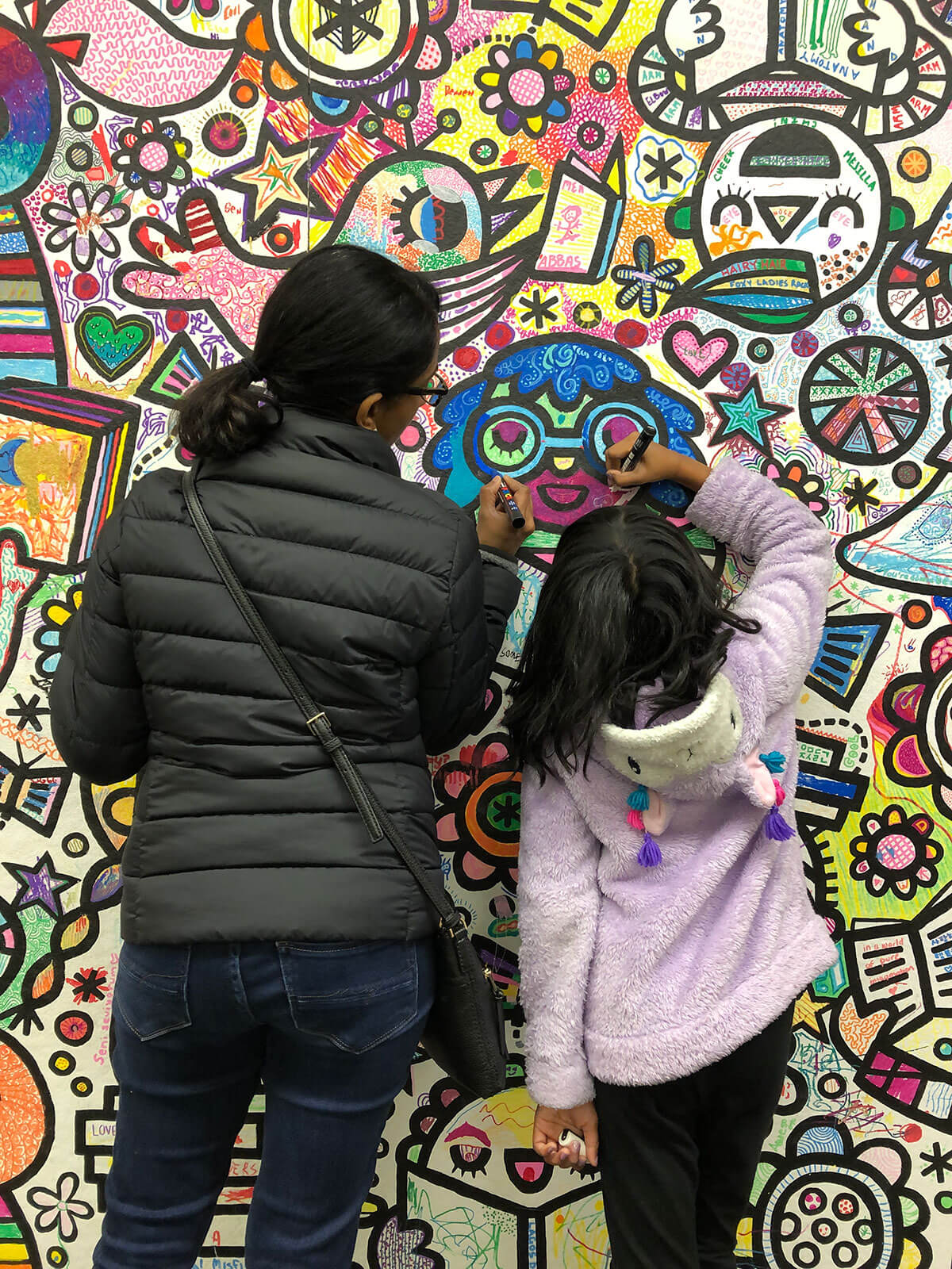 One piece that comes to mind is a mural I painted at the Bubbler at the Madison Public Library during my artist residency in 2019. The mural consisted of book-reading characters drawn with a thick black outline. As the library guests walked by my studio, I asked them to help color the characters with paint markers. Over two months, the mural slowly filled with colored doodles, tiny messages of love and inclusivity, and whimsical patterns. I love thinking about how many hands helped create the final art.