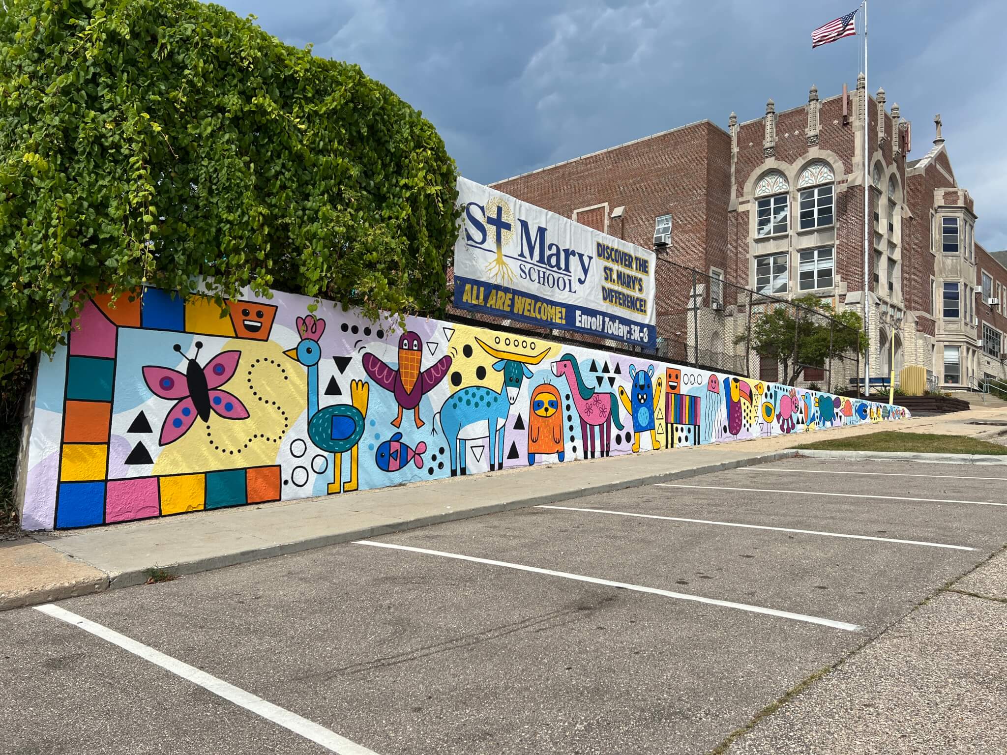 I recently finished a 95-foot mural next to a school playground in Janesville, Wisconsin [St. Mary School].