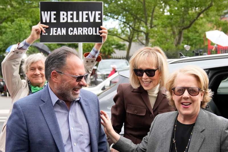 E. Jean Carroll, second from right, arrives at Manhattan federal court, Tuesday, May 9, 2023, in New York. A jury in New York City is set to begin deliberations in a civil trial over Carroll’s claims that Donald Trump raped her in a luxury Manhattan department store. (AP Photo/John Minchillo)
