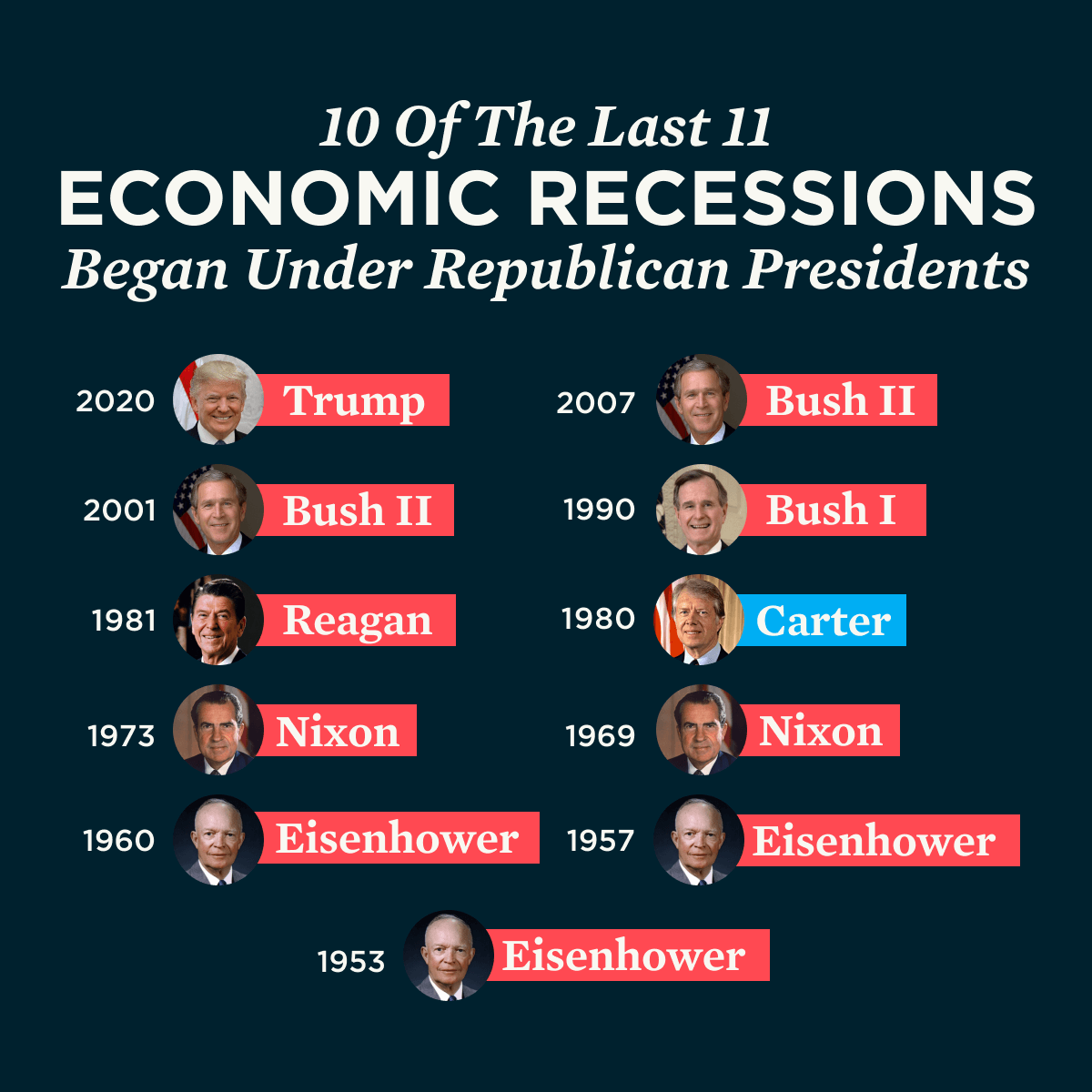 Let’s start with the most obvious: The US has had 17 recessions over the past 100 years. Thirteen began under Republican presidents, including the four largest: the Great Depression and the recessions of 1981, 2007, and 2020. The most recent recession under a Democratic president happened more than 40 years ago, in the final year of Jimmy Carter’s term.
