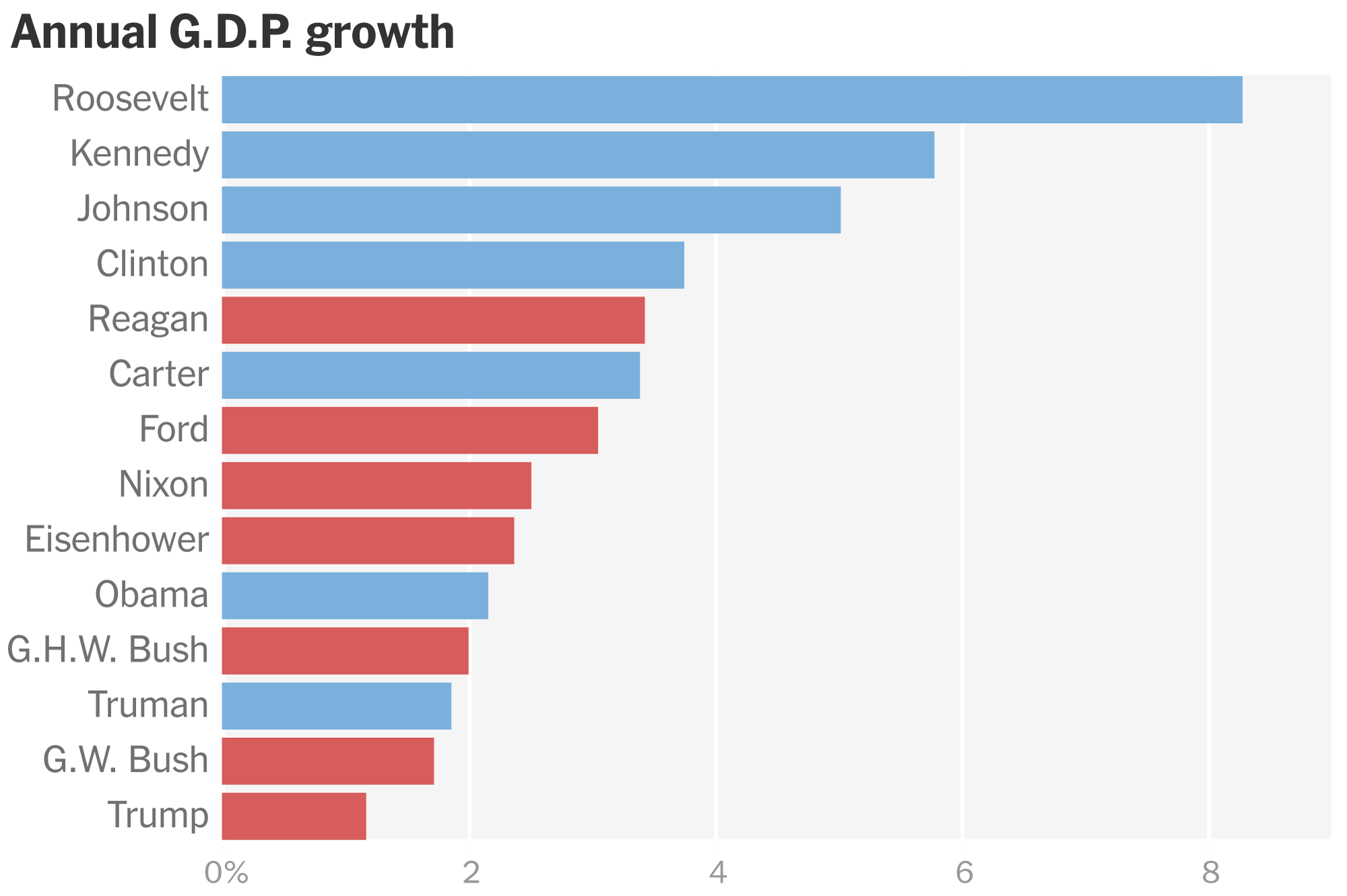 Democratic Presidents Franklin Roosevelt, John F. Kennedy, Lyndon B. Johnson, and Bill Clinton logged the biggest growth in gross domestic product in the past century. Three of the four presidents who oversaw the smallest GDP growth were Republicans George H.W. Bush, George W. Bush, and Donald Trump. The exception was Harry Truman.