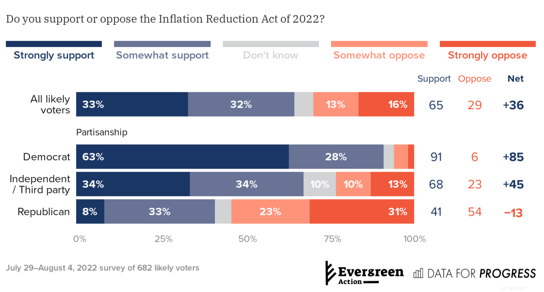 Evergreen Action and Data for Progress released the results early Thursday to UpNorthNews. The survey of 682 voters shows 65% support the Inflation Reduction Act after its components are read to them. The poll, using web panel respondents, has a margin of error of +/- 4 percentage points.
