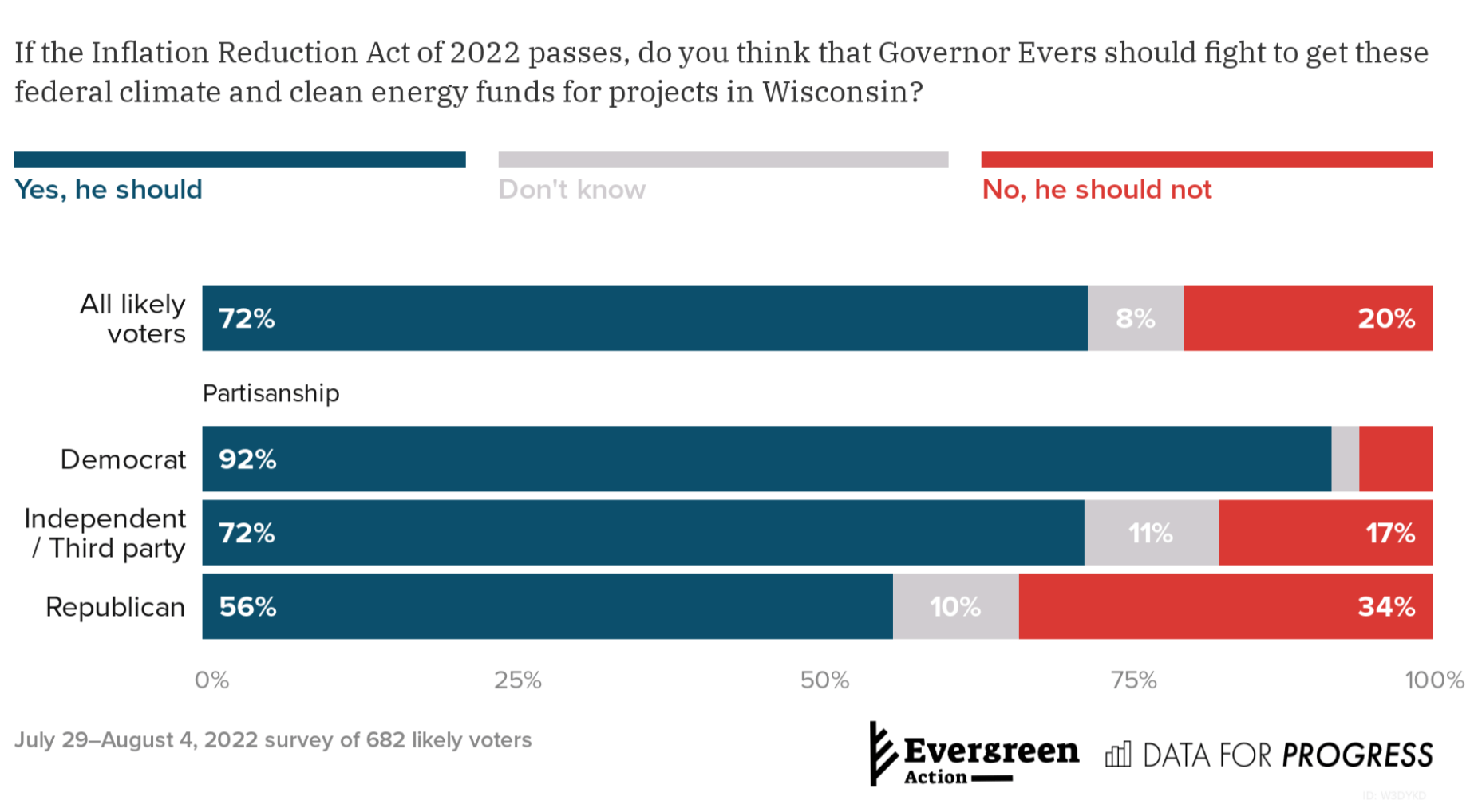 As for the $369 billion in the law for states to expand clean energy production and address climate change, even a majority of Republicans (56%) say Gov. Tony Evers should fight to get some of that funding for Wisconsin—a move favored by 72% of all those surveyed.