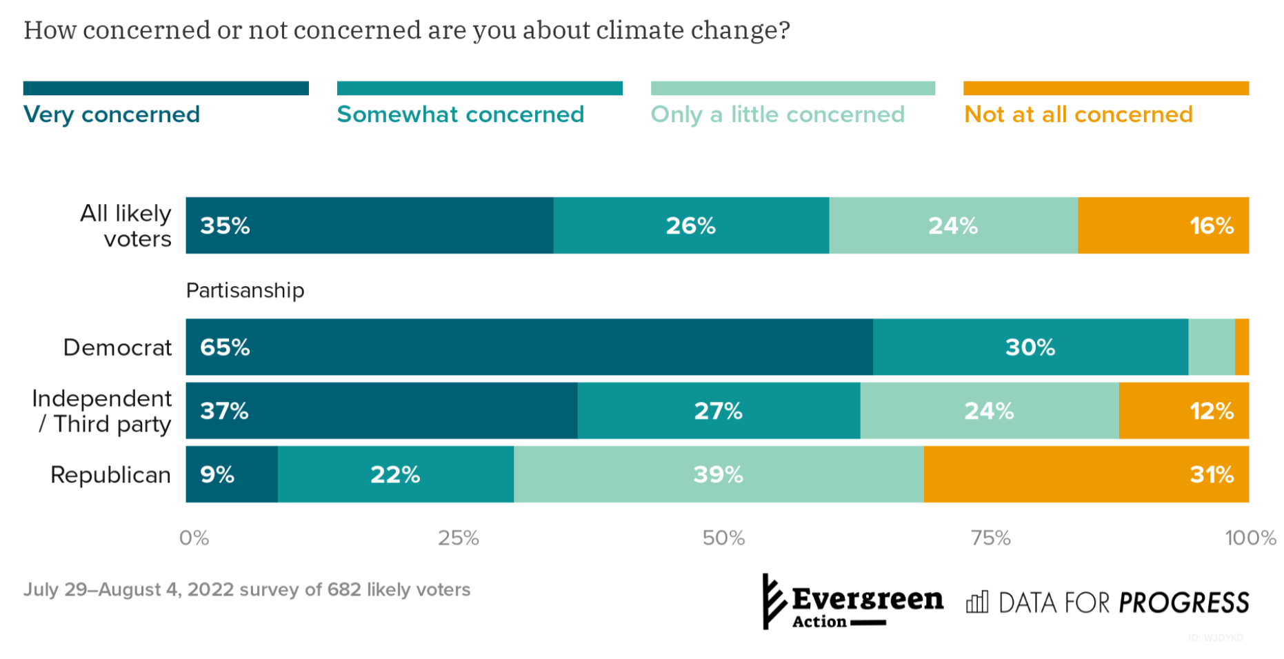 By comparison, only 31% of those Republican respondents said they were concerned about climate change—indicating their views on the climate are not blocking their support for what the new law is trying to do. (Not surprisingly, 95% of Democratic respondents have a level of concern about the changing climate, as do 64% of self-described independents.)