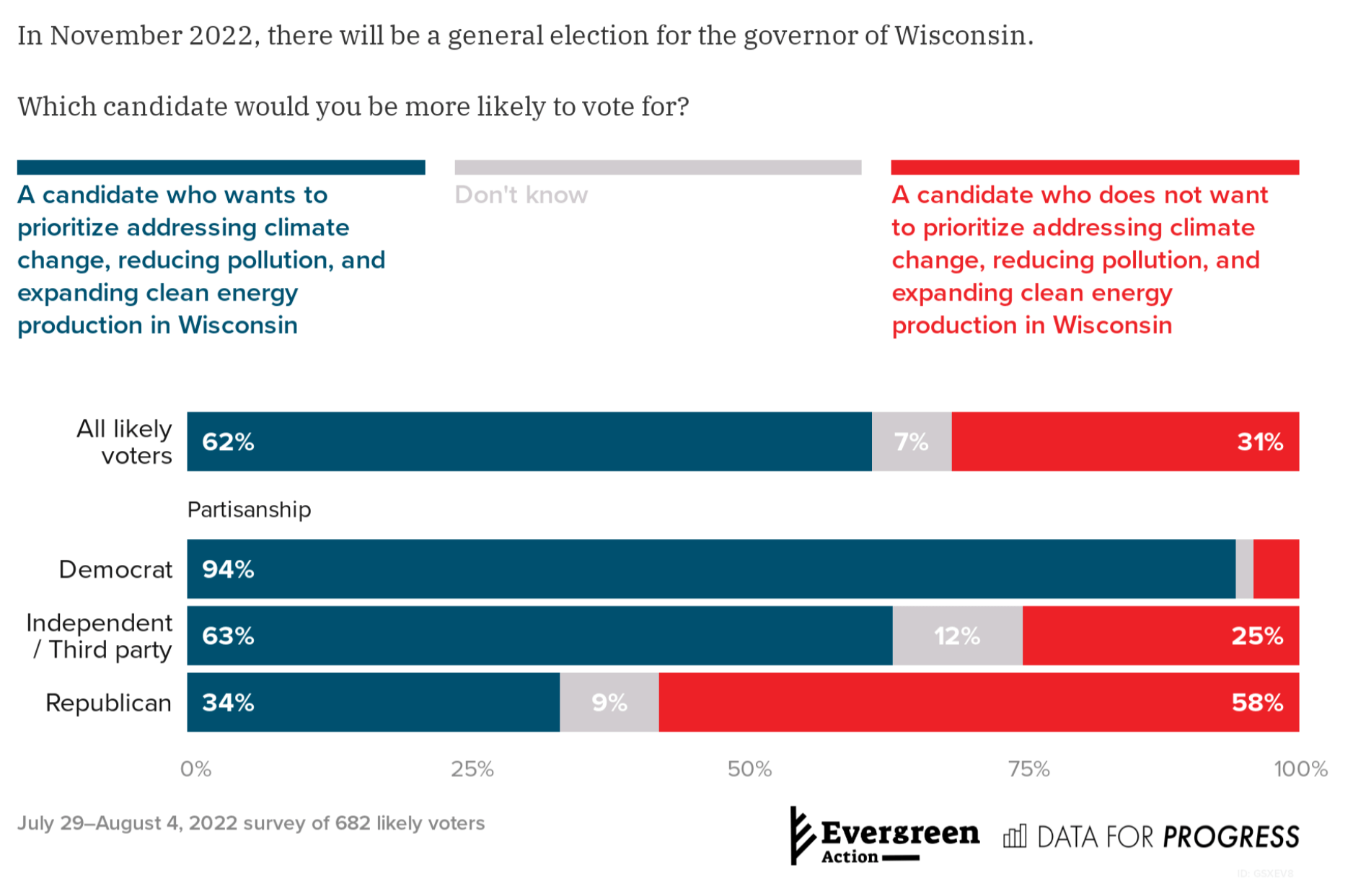 As for the upcoming gubernatorial election, 62% of voters say they would choose a candidate who wants to prioritize addressing climate change, reducing pollution, and expanding clean energy production across Wisconsin,” while 31% said they were more likely to choose the candidate who does not make those issues a priority (including 58% of Republicans).