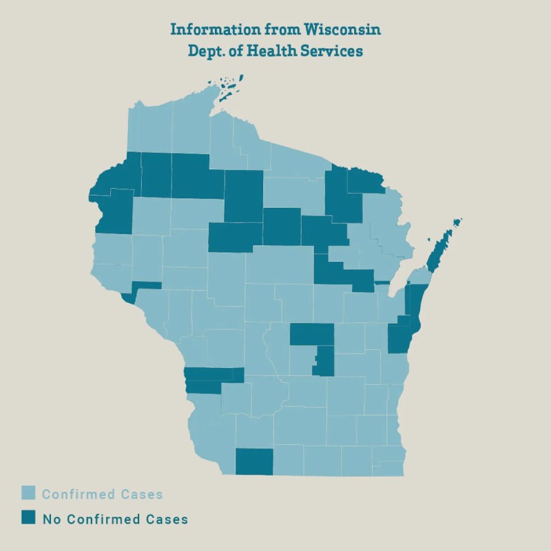 The Friday afternoon DHS report indicates 1,916 positive cases of COVID-19 and 37 deaths. However, updated numbers from Dane and Milwaukee counties put the case number at the 2,000 mark and 46 deaths.