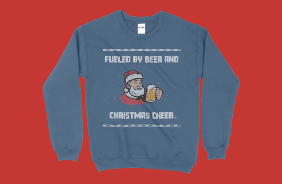 Then, there’s the Fueled by Beer and Christmas Cheer sweater, which (as it suggests) has the big man holding a beer (we’ll pretend it’s a Spotted Cow.)