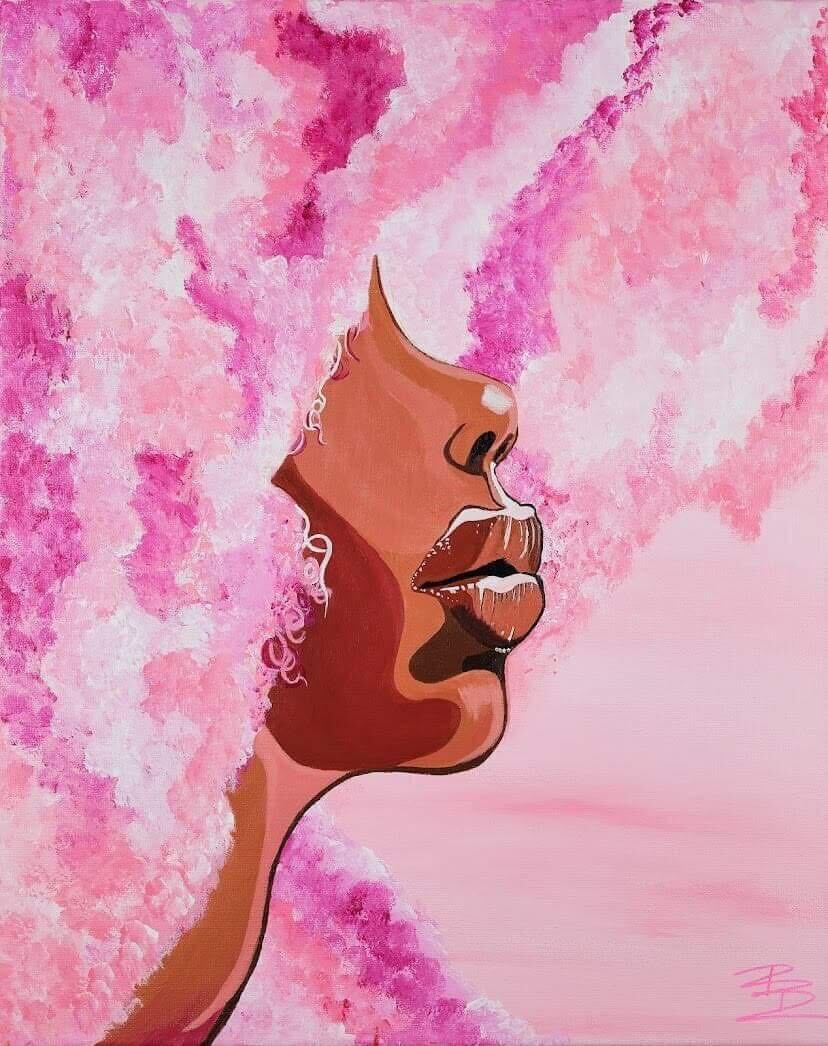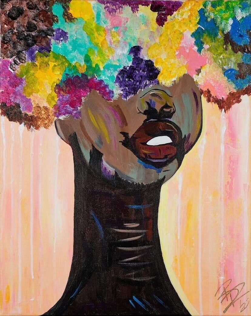 Brooklyn: My work reflects my love for acrylic paint, portraits, and abstracts of Black beauty. I create and sell original acrylic paintings, as well as clothes, mugs, and stickers with my art on them.