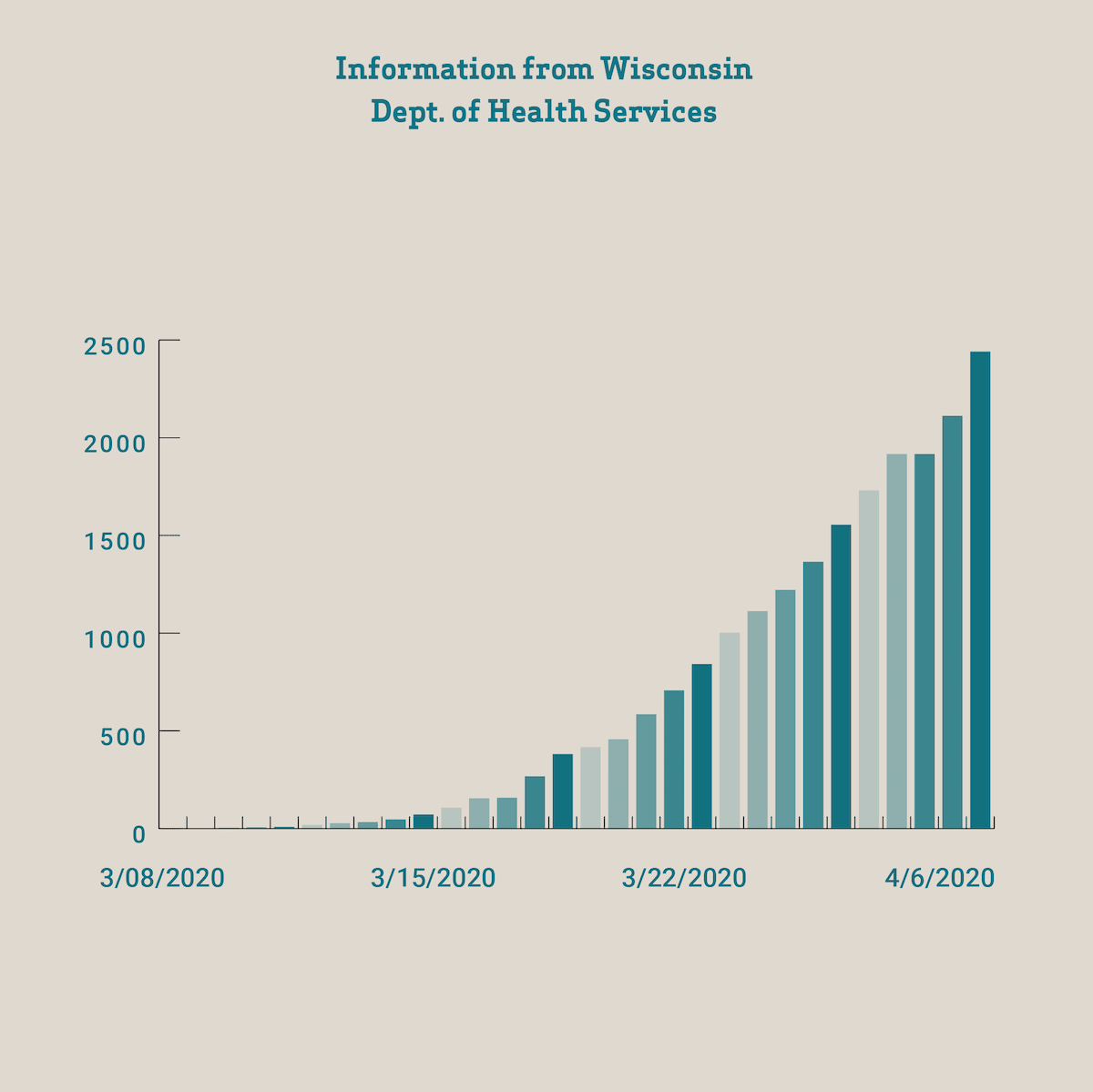 Areas with the most cases continue to be Milwaukee County with 1,491, Dane County with 305, Waukesha with 174, Kenosha with 129, Racine with 77, Ozaukee with 70, Fond du Lac 48, Brown 47, Sheboygan 31, Columbia 24 and Eau Claire with 21.